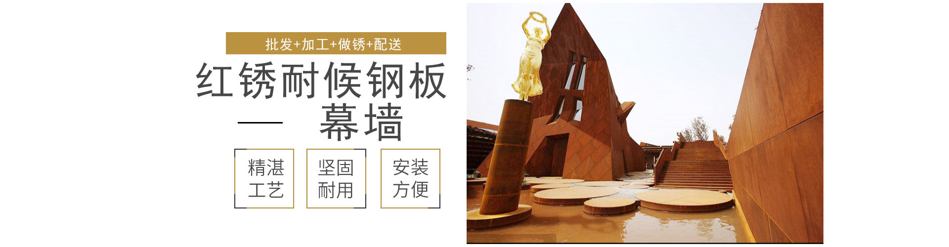 山東沃卡金屬制品有限公司提供耐候板深加工,如雕花、鏤空、刻花、折彎等。還有耐候板的園林景觀裝飾加工,如銹鋼板、紅銹鋼板等。鐵紅色銹蝕鋼板(即紅色幕墻鋼板,景觀鋼板,雕刻鋼板)是介于普通鋼和不銹鋼之間的價廉物美的合金鋼系列,在融入現代冶金新機制、新技術和新工藝后得以可持續發展和創新,屬世界超級鋼技術前沿水平的系列鋼種之一。鐵藝紅幕墻鋼板由普碳鋼添加少量銅、鎳等耐腐蝕元素而成,具有優質鋼的強韌、塑延、成型、焊割、磨蝕、高溫、疲勞等特性;耐候性為普碳鋼的2~8倍,涂裝性為普碳鋼的1.5~10倍,能減 薄使用、裸露使用或簡化涂裝使用。該鋼種具有耐銹,使構件抗腐蝕延壽、減薄降耗,省工節能的特性,使構件制造者、使用者…